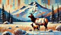 Majestic Roosevelt Elk and Young Amidst Snowy Mount Hood