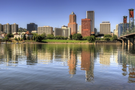 Bask in the serene beauty of Portland, Oregon, as captured in this vibrant image featuring the downtown skyline and the Hawthorne Bridge. The clear blue skies and bright sunshine enhance the urban architecture, while the calm waters of the river perfectly mirror the city's bustling landscape. This picturesque scene exemplifies urban harmony with nature, offering a tranquil yet dynamic cityscape that invites admiration and exploration. The bridge’s distinct green framework adds a touch of historical charm to the modern city backdrop.