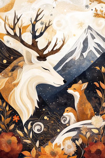Awash in warm tones and complex textures, this intricate artwork transports viewers into a dreamy forest where wildlife and flora harmonize. A majestic deer with stark white fur and antlers resembling tree branches stands serenely beside a curious fox under a celestial sky sprinkled with delicate snowflakes. Below them, a rich tapestry of wildflowers and spirals adds a mystical quality to the scene, blending reality with fantasy. The towering mountain in the background suggests a serene, untouchable permanence, contrasting with the ephemeral quality of the swirling stars and soft petals. Each element—whether celestial, floral, or fauna—is rendered with a precision that celebrates the natural world's intricate beauty and interconnectedness.