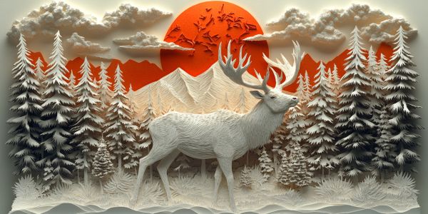 Title: Majestic Paper Mache Elk in a Snowy Mountainous Landscape under a Red Sun