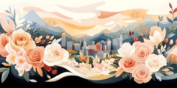 Title: Enchanting Portland Skyline Enveloped in Blossoms of Roses