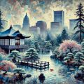 Serene Portland Japanese Garden Merged with Urban Skyline Art