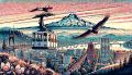 Soaring High Over Portland: Aerial Tram with Mount Hood in Sunset Hues