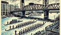 Dynamic Dragon Boat Practice on Willamette River Beneath Portland Bridges
