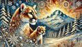 Winter Majesty: Mountain Lion and Cub Against Mount Hood