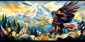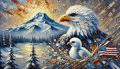 Majestic Bald Eagle Soaring Over Stylized Northwestern Landscape