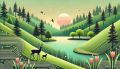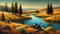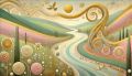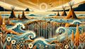 Enchanted Riverscape in Klimt Style: Deers and Swirling Hills at Sunset