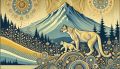 "Springtime Wander: A Gray Wolf and Cub against Mount Hood"