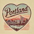 Vintage Portland Heart Illustration Featuring Iconic Cityscape and Mt. Hood