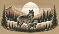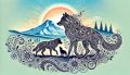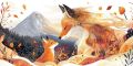 Artistic Red Fox and Cub Silhouette Against Mount Hood Illustration
