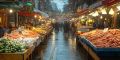 Bustling Market Street on a Rainy Evening in Portland, Oregon