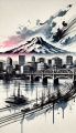Dramatic Ink Wash of Portland Skyline and Mount Hood