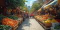 Bustling Market Street Scene With Fresh Produce and Shoppers