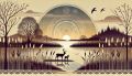 A Serene Sunset Over a Misty Lake with Deers in Silhouette