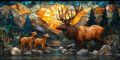 Majestic Elk with Two Cubs in Stained Glass Art Style