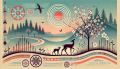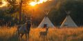 Sunset Embrace: Majestic Deer and Fawn Near Native Teepees