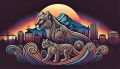 Enigmatic Portland Skyline with Symbolic Imagery and Golden Embellishments