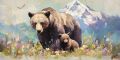 Vibrant Palette Knife Art of Mountain Lion and Cub Against Mount Hood