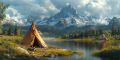 Tranquil Wilderness at Dusk: Teepees by a Mountain Lake