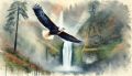 Majestic Bald Eagle Over Multnomah Falls in Watercolor Impressionism