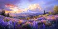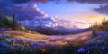 Enchanting Twilight at a Blossoming Meadow near Snowy Peaks