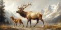 Majestic Elk and Fawn Amidst Misty Mountainous Landscape