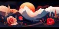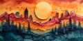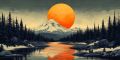 Majestic Mountain Landscape with Red Sun in Ukiyo-e Style Art