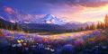 Majestic Mt. Hood Overlooking Vast Field of Wildflowers at Sunset