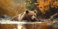 Autumn Embrace: A Bear Enjoys a Peaceful Swim Amongst Falling Leaves