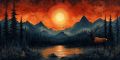 Majestic Mountain Landscape with Red Sun and Reflective Lake
