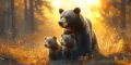 Golden Hour Embrace: Mother Bear and Cubs in Autumn Forest