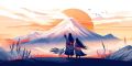 Autumn Embrace: A Couple's Silhouette Against Majestic Mountain