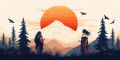 Majestic Wolf Silhouette Against Vibrant Sunset and Mountain