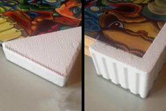 One advantage to styrofoam corners is the ease with which they can be altered. When applied to a frame that grows deeper toward the center, a triangle piece can be cut from the top of the corner, to allow for this rise, without sacrificing the integrity of the protection.