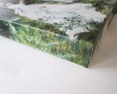 The term "gallery wrap" describes the mounting style of a canvas print or original painting. In a gallery wrap, the image is extended beyond the visible front of the canvas, either by mirroring the edges or leaving the outer area uncropped. The canvas is stretched around stretcher bars (lengths of wood nailed together to form a frame) so that the imaged edges show along the sides of the piece.