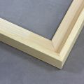 This floater frame features a light natural wood finish with a smooth surface and subtle grain that highlights the beauty of the raw wood. At 1-1/16 " deep, it offers a clean, airy floating effect that complements bright, minimalist, and nature-inspired artworks.